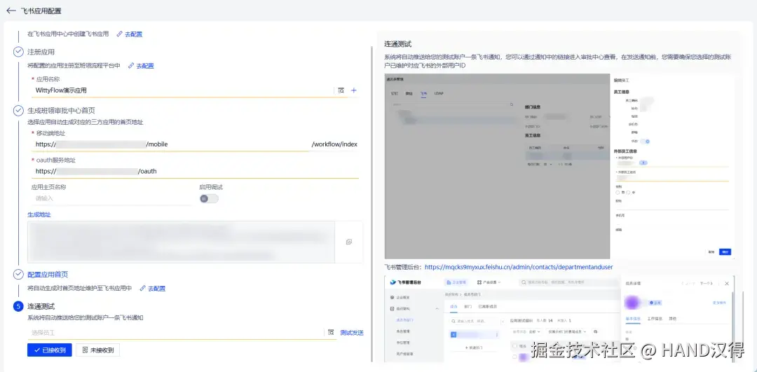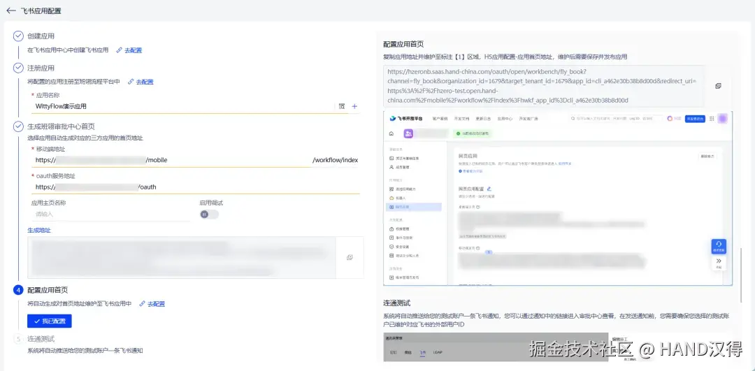 步骤三:生成班翎审批中心首页 系统将根据您的环境信息自动生成飞书移动端首页地址。