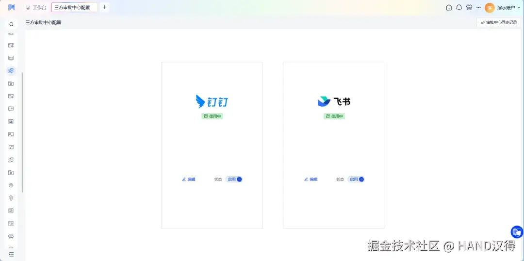 ①子应用关联:选择审批中心关联使用的飞书子应用/钉钉子应用。关联后班翎将本系统的待办任务自动同步至对应的飞书/钉钉审批中心