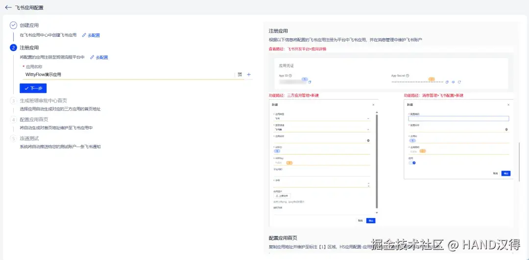 步骤二:注册应用 将飞书中创建的应用注册至当前系统,您需要获取飞书应用的关键信息并在系统的中进行配置。
