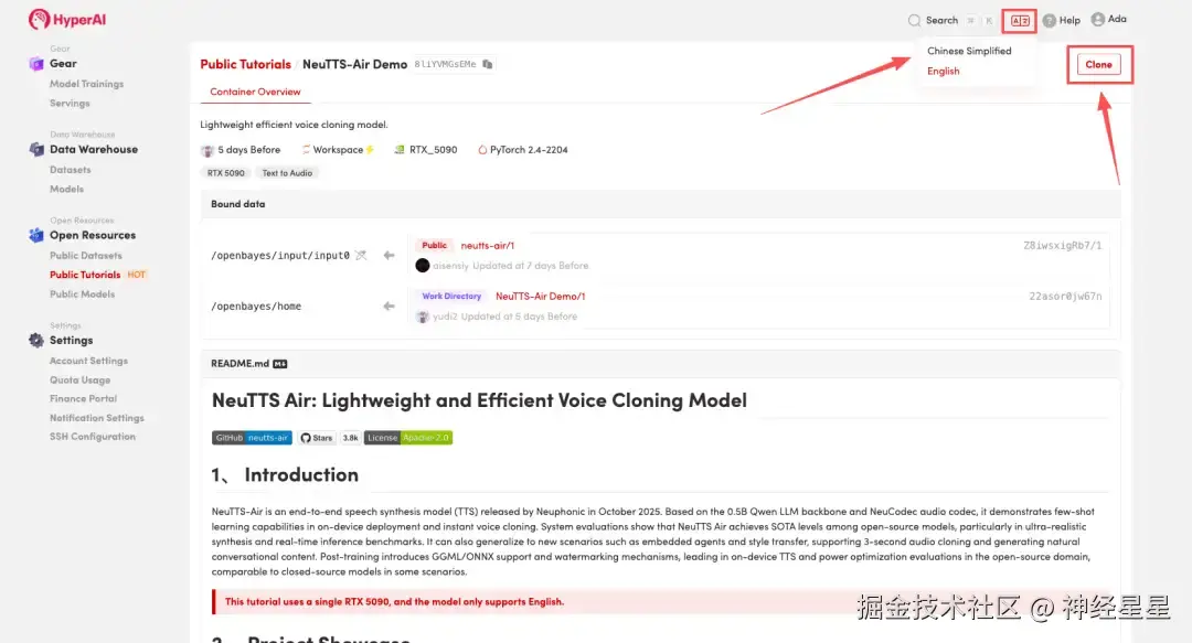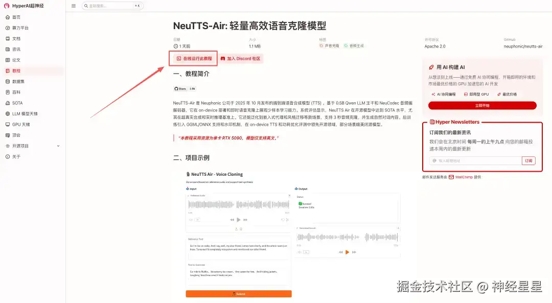 「NeuTTS-Air: 轻量高效语音克隆模型」现已上线 HyperAI超神经官网(hyper.ai)的「教程」板块, 快来一键部署体验!