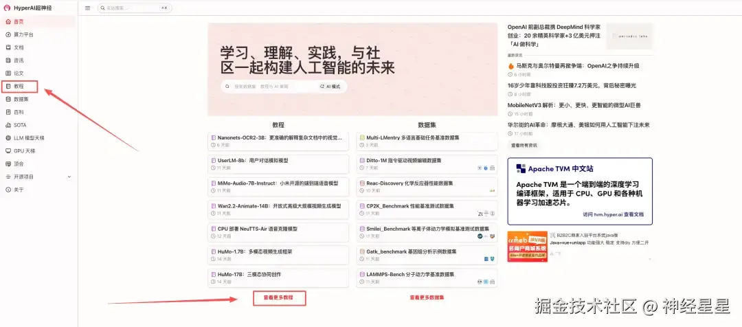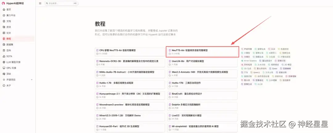 1.进入 hyper.ai 首页后,选择「教程」页面,或点击「查看更多教程」,选择「NeuTTS-Air: 轻量高效语音克隆模型」,点击「在线运行此教程」。