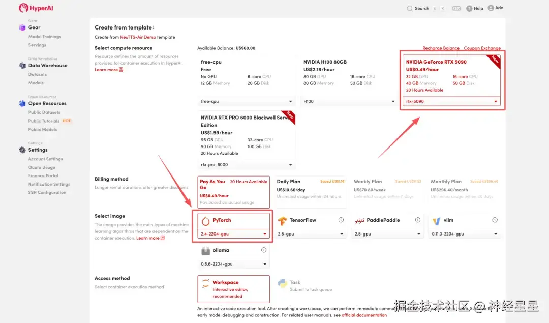 3.选择「NVIDIA GeForce RTX 5090」以及「PyTorch」镜像,按照需求选择「Pay As You Go(按量付费)」或「Daily Plan/Weekly Plan/Monthly Plan(包日/周/月」,点击「Continue job execution(继续执行)」。