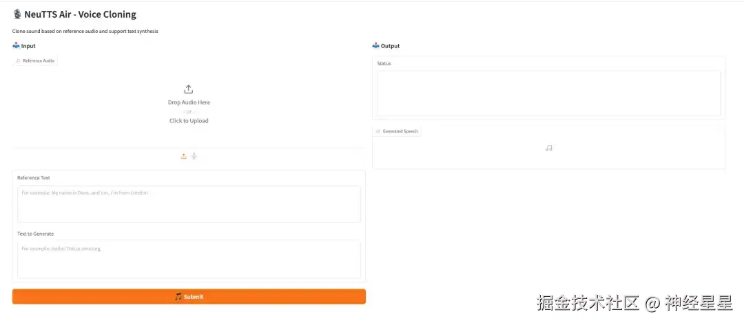 进入 Demo 运行页面后,在「Reference Audio」上传参考音频,在「Reference Text」文本框中输入参考文本,将克隆后希望得到的音频文本内容输入「Text to Generate」,点击「Submit」后稍等片刻即可得到克隆音频。
