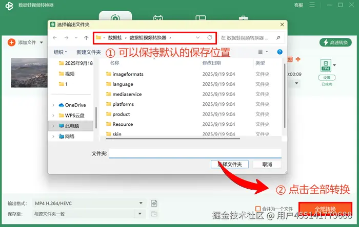 第三步:最后,为即将进行视频格式转换的文件选择保存路径,点击右下角的全部转换按键,稍作等待即可。