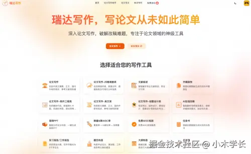 工具简介:瑞达写作能够快速生成高质量初稿,具备智能改稿功能,内置降重技术,可有效控制查重风险,简化论文写作过程。