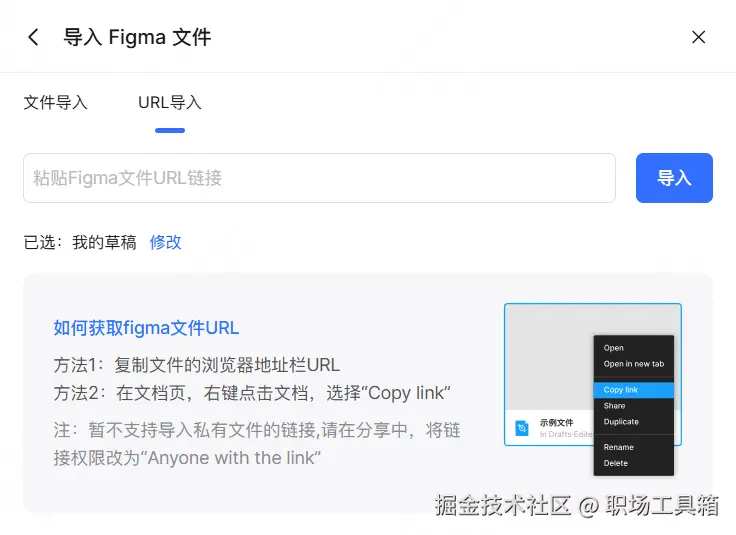 第二种方式则更为高效,即通过URL链接直接导入。你只需在Figma中获取文件的分享链接,粘贴到Pixso的导入窗口,Pixso便会自动解析并获取文件内容,完成云端到云端的无缝迁移。这种方式省去了本地下载和上传的步骤,尤其适合批量迁移项目文件。