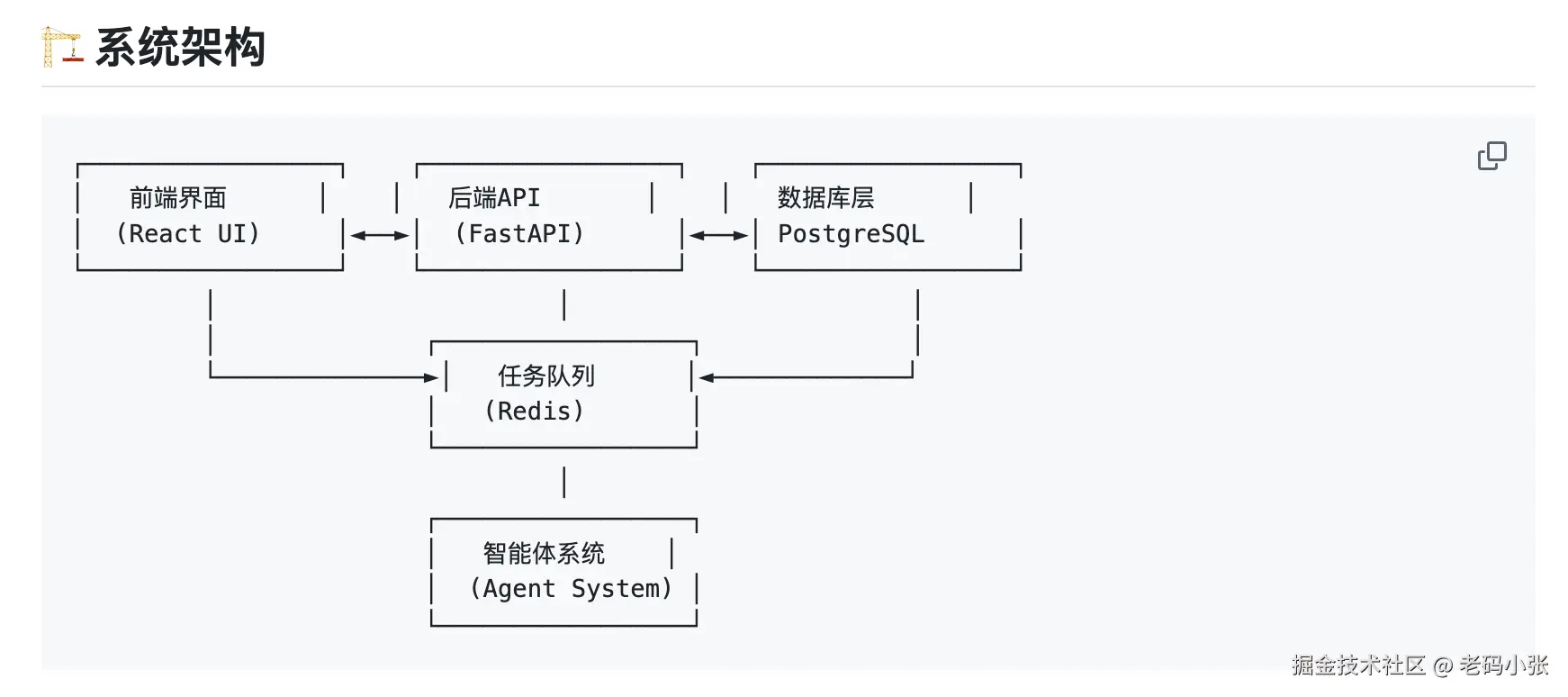 简单来说:一个 agent = 大模型(或策略) + 一套工具(ToolRegistry)+ 一个调度器/队列(AgentScheduler + Redis/任务队列)+ 状态/检查点系统。项目 README 里把它做成了完整工程:前端 React、后端 FastAPI、Redis 任务队列、Postgres 存储、Prometheus/Grafana 监控。这个结构听起来很普通,但关键在于把“做事”拆成了可观测、可重试、可计费的单元。
