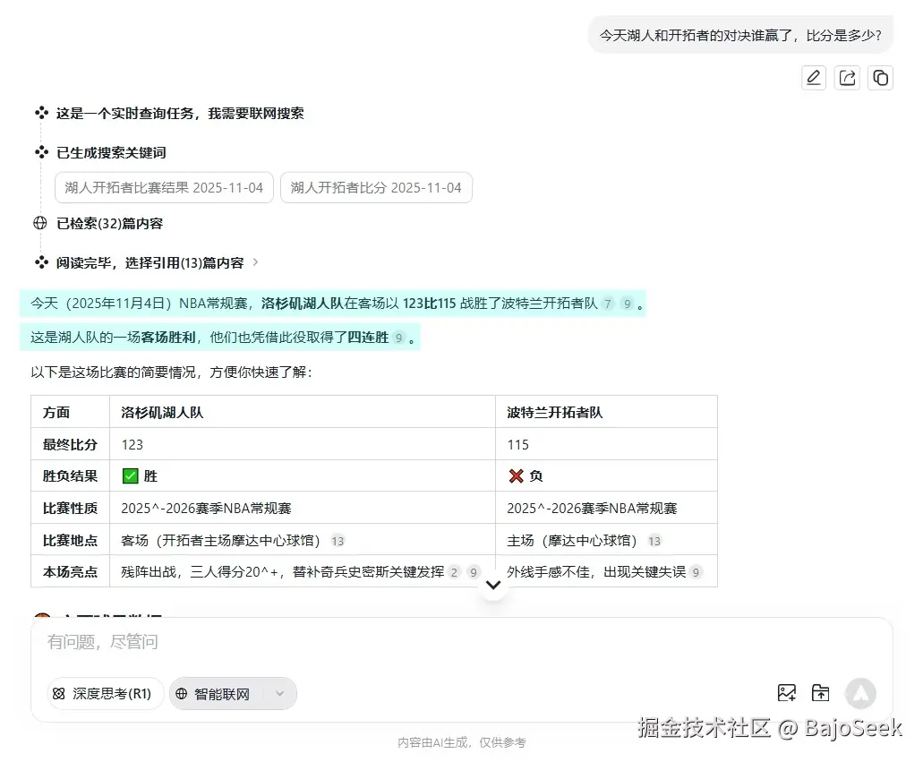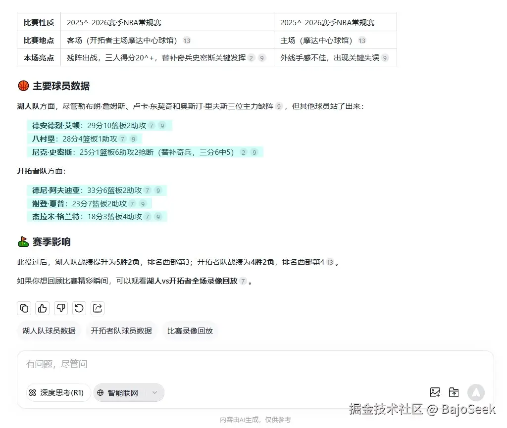 今天上午就有小伙伴问我:“湖人和开拓者谁赢了?”,让我带你们体验 BajoSeek 如何用其独有的 “智能联网” 和 ”MCP调用“ 功能,将你的查询体验升级到极致!秒速获取最新战报!现在就来和大家分享这场精彩对决!