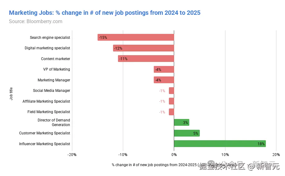 - 营销领域正在分裂为传统营销岗(萎缩)和网红营销岗(增长)。