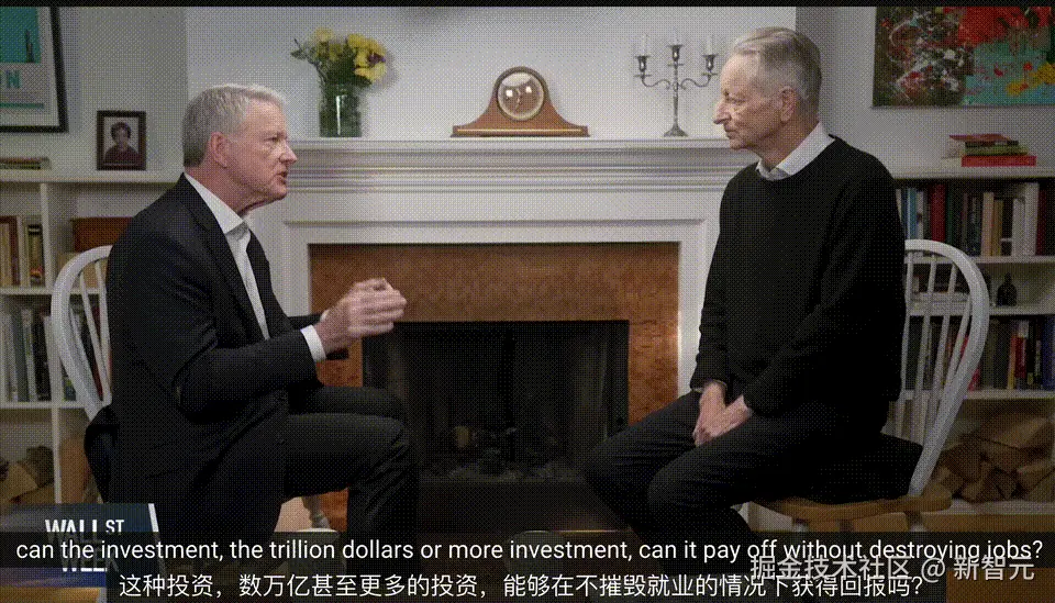 主持人问及 Hinton 一个沉重又值得深思的问题:万亿美元投资能否在不摧毁就业的情况下获得回报?