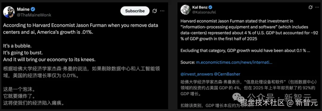 据哈佛经济学家 Jason Furman 的说法,数据中心和 AI 领域的投资,在美国 2025 年上半年的 GDP 中,贡献了约 92% 增长份额。