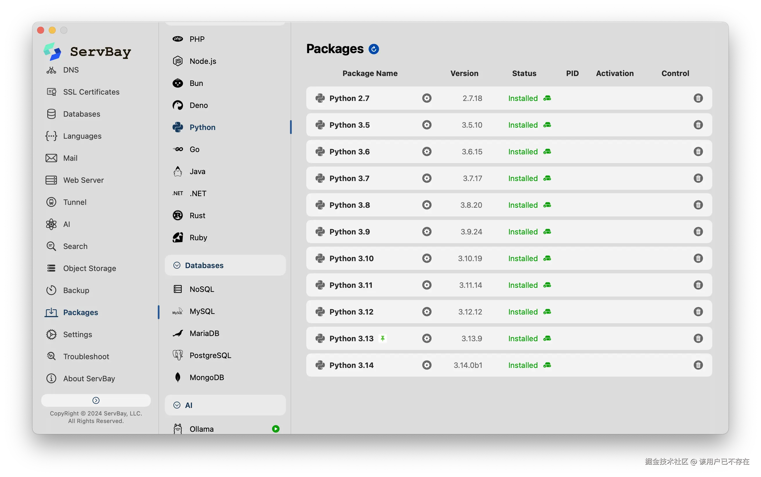 - 多版本共存:我手头有好几个项目,有的用 Python 3.11,有的老项目还停在 Python 2.7。ServBay 能让它们在我的电脑里和谐共存,我想在哪个项目上工作,就切换到哪个版本,非常方便。