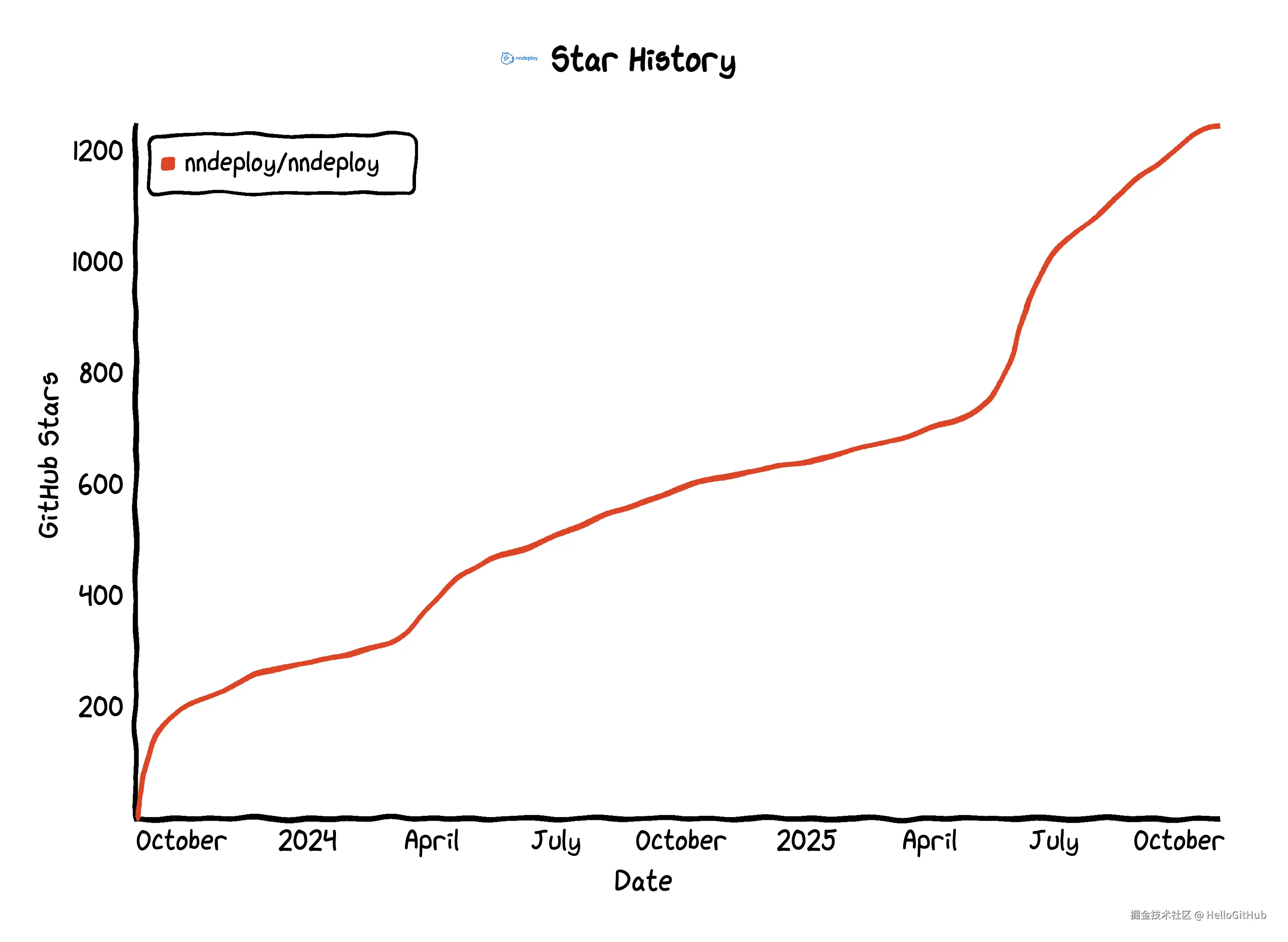 nndeploy 从最初的想法到正式开源,打磨了近一年。2023 年 8 月 28 日,nndeploy 第一个版本正式开源。当天就收到了 CGraph 作者 Chunel 的认可和热情推广,项目很快突破 100 Star。