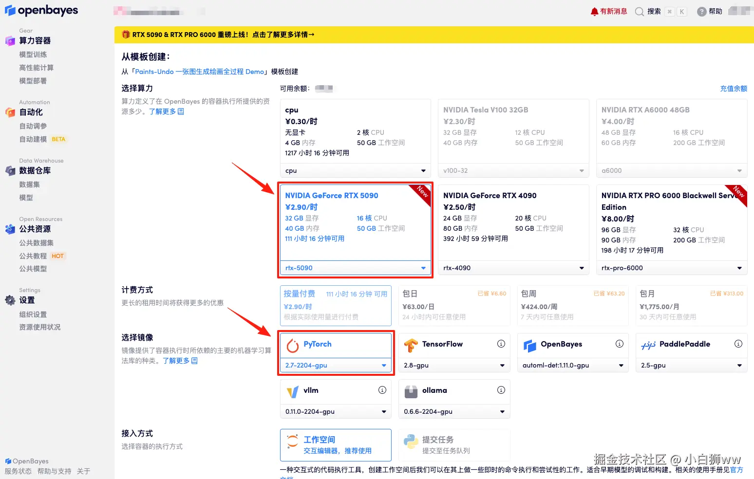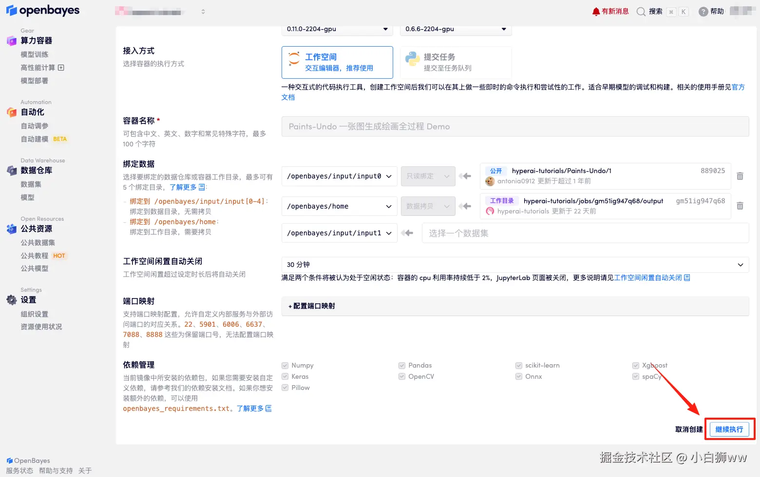 在当前页面中看到的算力资源均可以在平台一键选择使用。平台会默认选配好原教程所使用的算力资源、镜像版本,不需要再进行手动选择。点击「继续执行」,等待分配资源。