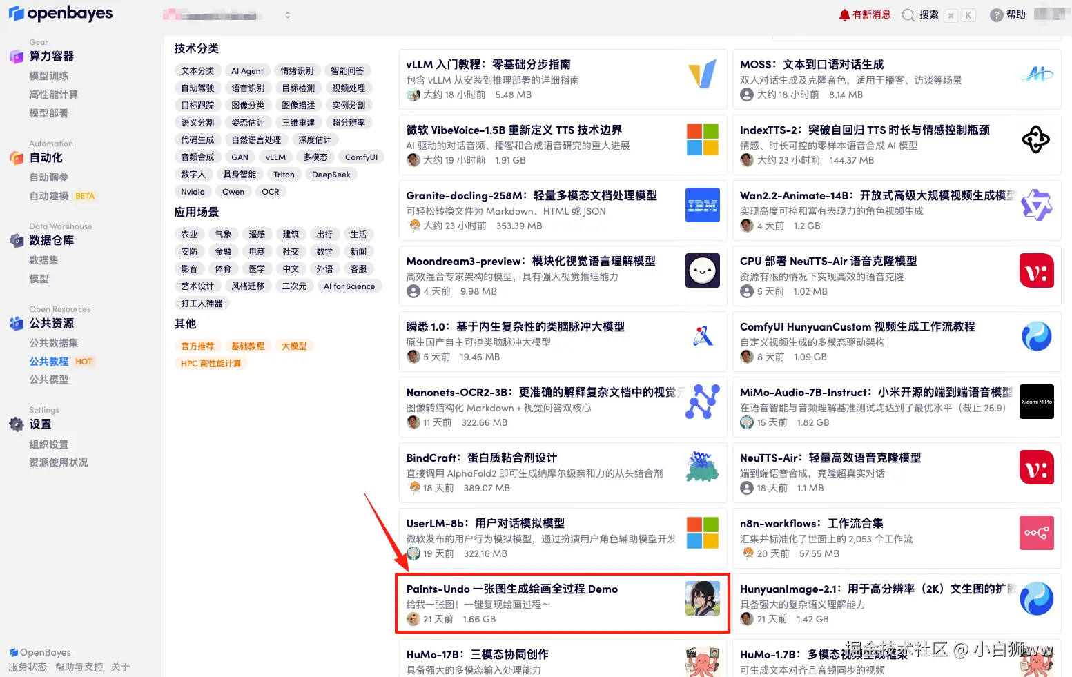 首先点击「公共教程」,找到「Paints-Undo 一张图生成绘画全过程 Demo」,单击打开。