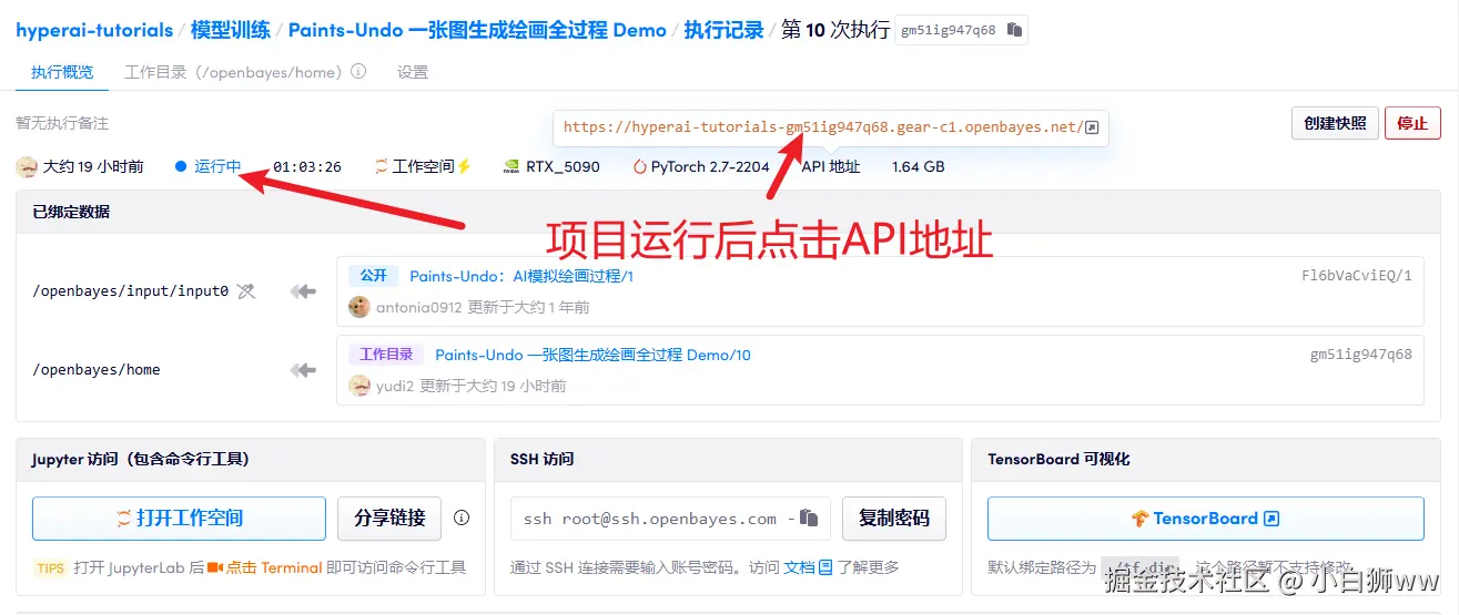 数据和代码都已经同步完成了。容器状态显示为「运行中」后,点击「 API 地址」,即可进入模型界面。