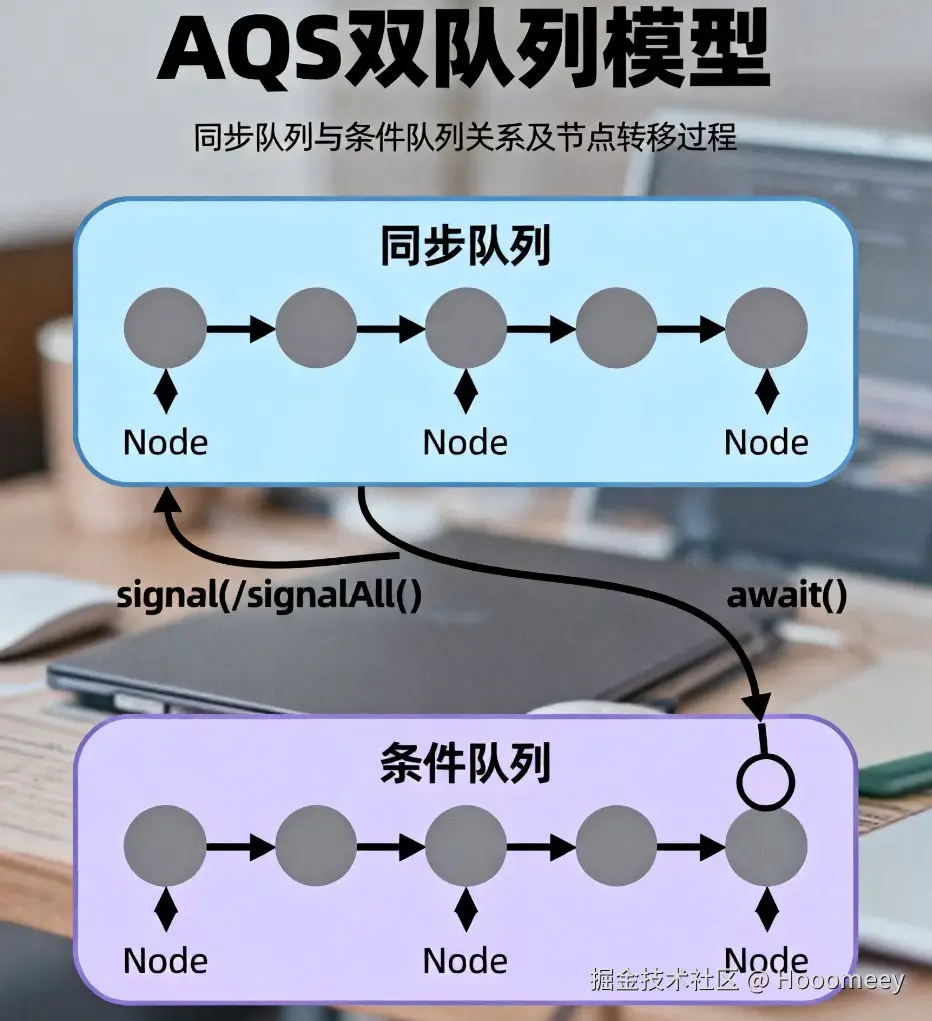 1.「前置条件」:await() 必须在持有锁时调用2.「状态转换」:释放锁 → 进入条件队列 → 被唤醒后转移至同步队列3.「竞争机制」:signal() 后需重新竞争锁,无优先级保证❞