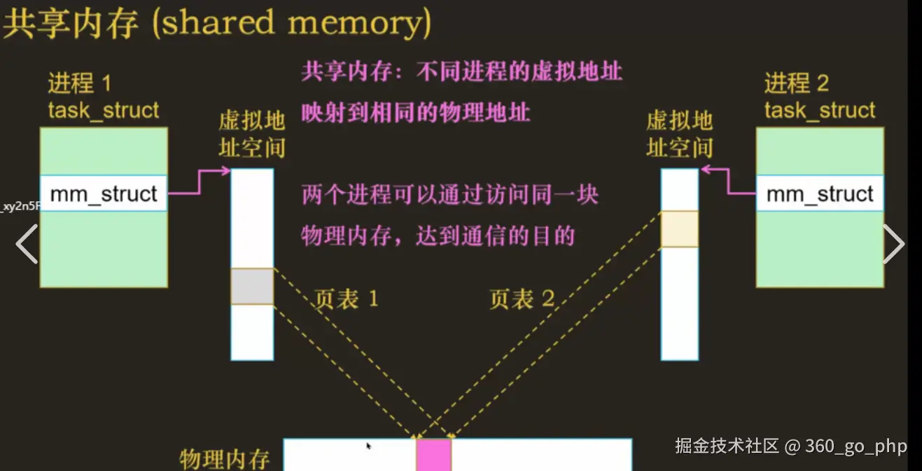 shmget和shmat)可以让多个进程将某一块物理内存区域映射到各自的虚拟地址空间,这样它们就能直接读写共享内存区的数据。共享内存是一种高效的进程间通信方式,但需要通过信号量、互斥锁等机制来避免竞争条件。