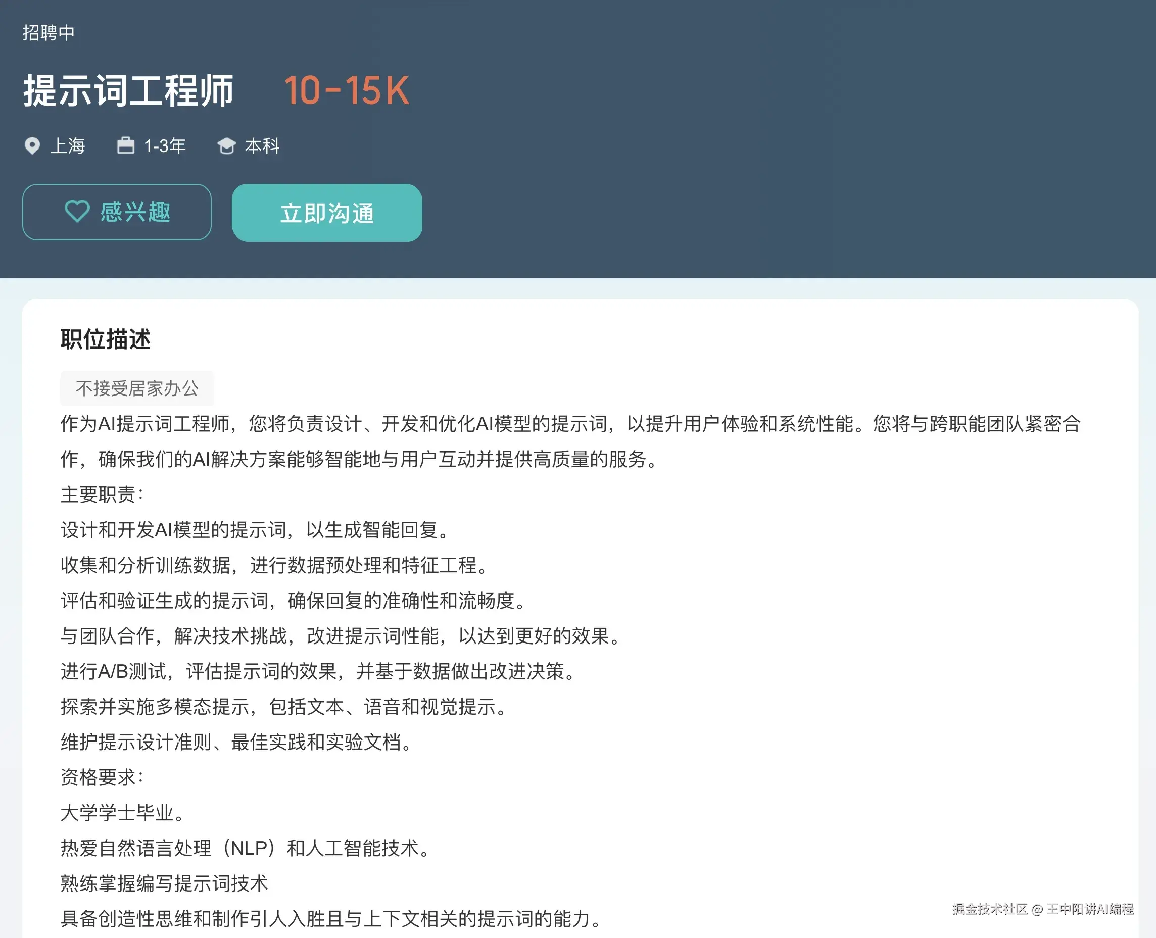 因为 AI 大模型生成的内容是不确定的,构建一个能够按照预期生成内容的提示词既是一门艺术,也是一门科学。提示词的质量直接影响到 AI 大模型输出的结果,因此这也是 AI 应用开发的关键技能,很多公司专门招聘提示词工程师。