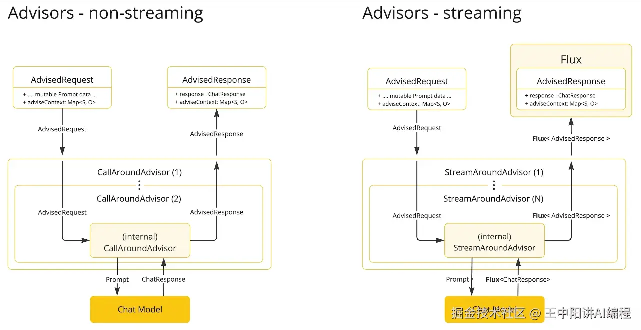 - CallAroundAdvisor:用于处理同步请求和响应(非流式)