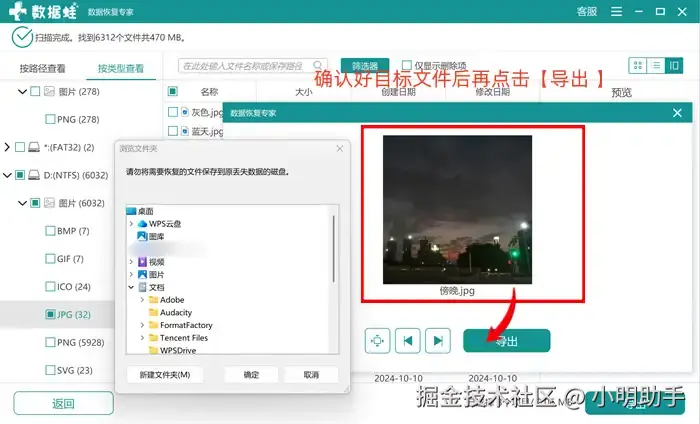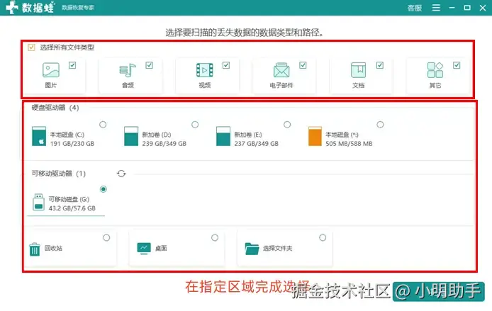 扫描设置页面主要分为:文件类型选择、扫描位置选择,选好后点击【扫描】即可完成。