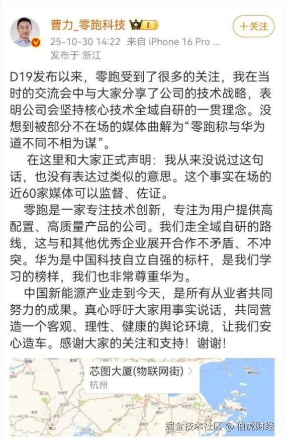 多家媒体报道称,曹力表示零跑拒绝与华为“联姻”的原因是“道不同不相为谋”,这略带“引战”意味的发言,也引起了车圈粉丝的激烈讨论。不过,曹力很快在社交平台发布声明称,“从来没说过这句话,也没有表达过类似的意思。”