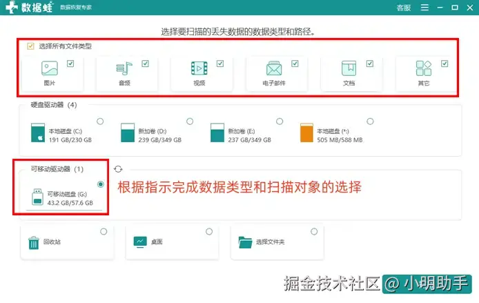 数据 蛙恢复专家操作十分简单,只需要我们将目标SD卡装入读卡器,然后再打开软件,我们就能在首页中选择SD卡作为扫描对象,进行内存卡数据恢复了。