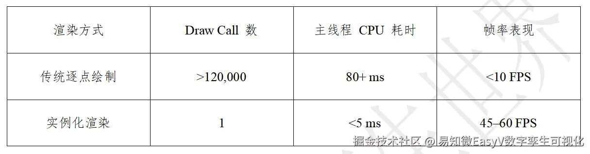 传统做法中,每个点需单独发起一次绘制命令,百万级点集将导致CPU–GPU接口极度拥堵。EasyTwin基于WebGL2实现了实例化渲染,将所有点统一为一个模板几何结构,仅传入每个点的差异化属性,实现批量渲染。