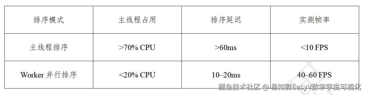 高斯渲染需确保透明叠加顺序正确,每帧都需基于相机位置进行点集深度排序。在主线程中执行排序将严重阻塞界面响应,影响交互体验。为此,EasyTwin将排序任务封装进Web Worker中,主线程仅负责相机状态同步与排序结果应用,计算全程由子线程完成。