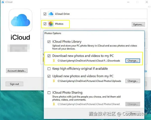 在笔记本电脑上,使用相同的 Apple ID 登录 iCloud。勾选“照片”,然后选择“将新照片和视频下载到我的电脑”。然后点击“完成”>“应用”。现在,您的照片已通过 Wi-Fi 上传到 iCloud。