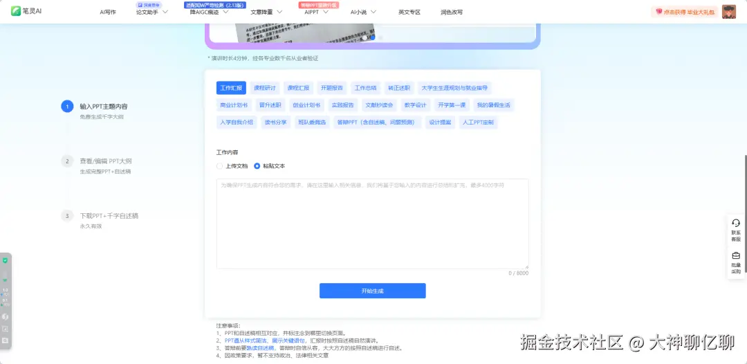 - 自述稿生成:在生成PPT的同时,自动生成匹配的演讲稿,方便用户直接使用。