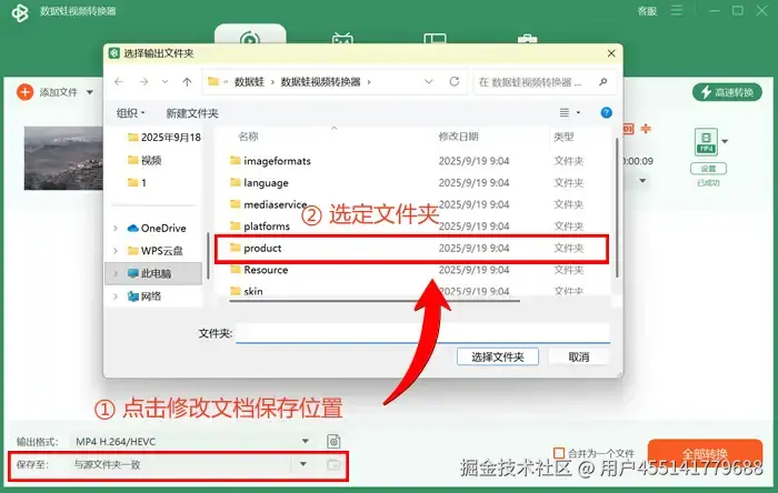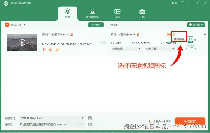 第三步:想要将视频保存到特定位置?你可以点击左下方的 【保存至】 右侧的小箭头,为压缩好的视频指定好保存路径,最后再点击 【全部转换】 。