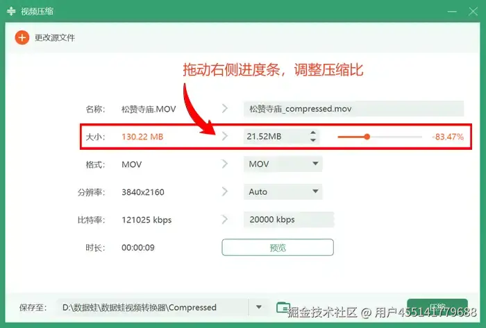 第二步:视频导入完成并在主界面显示之后,点击左侧如图所示的橙色压缩图标,在弹窗中调整压缩比,直到压缩后大小的数值令你满意了,再点击 【保存】 按键。