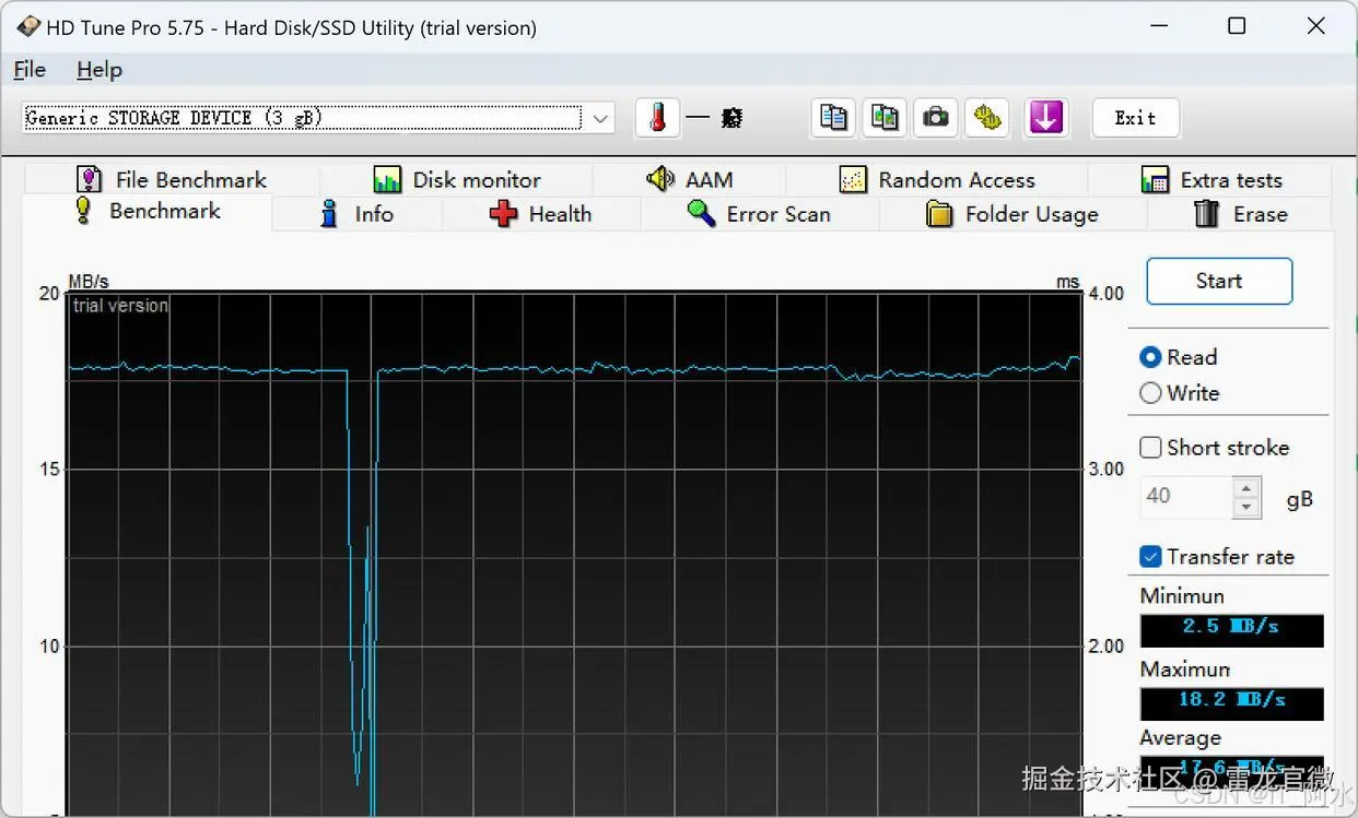 通过使用磁盘检测工具对整个空间进行写入测试,平均写入速度可达17.6MB/S。