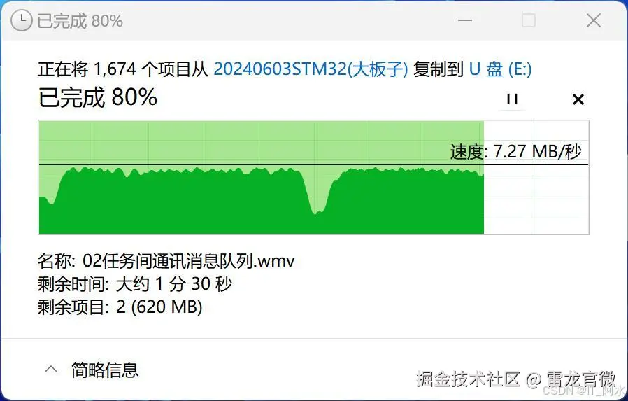 在实际拷贝文件测试中,可以看到平台写入速度为7MB/S。
