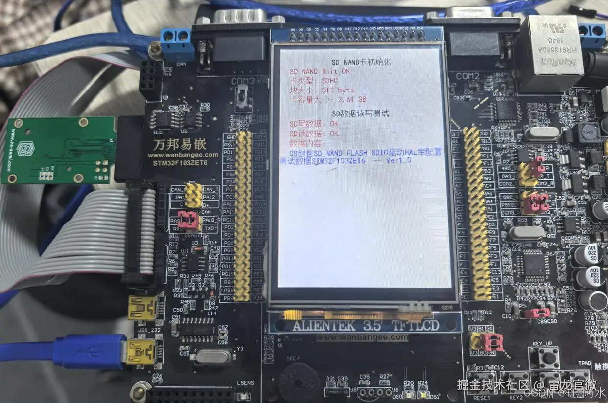 将SD NAND FLASH插入到STM32 SD卡座上,使用SDIO方式驱动,读取卡容量信息并进行数据读写测试。
