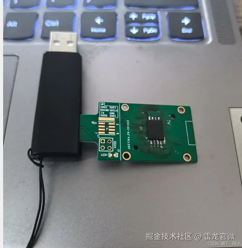 将创世的SD NAND存储芯片焊接到官方提供的测试底板,然后使用读卡器插入电脑端,硬件实物如图所示: