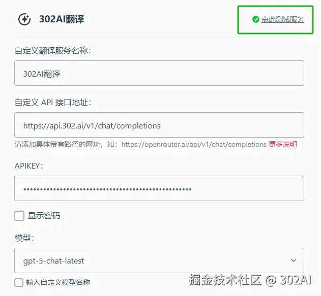 完成填写API接口,APIKEY与模型选择后,点击“点此测试服务”,测试成功后会显示绿色对钩符号.