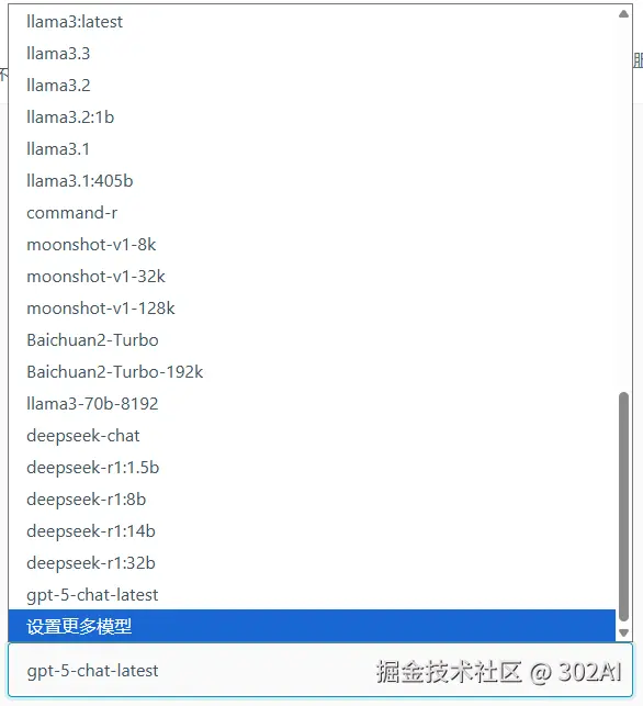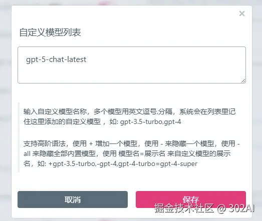 模型名称建议在302.AI进行查找,复制。如图gpt-5-chat-latest就是作者手动添加的模型。