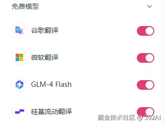 在完成安装注册登录的流程后,用户即可免费使用:谷歌翻译,微软翻译,GLM-4 Flash以及硅基流动翻译这4款基础模型,不限次数地使用包括网页翻译,PDF翻译,Youtube字幕翻译等常见功能。
