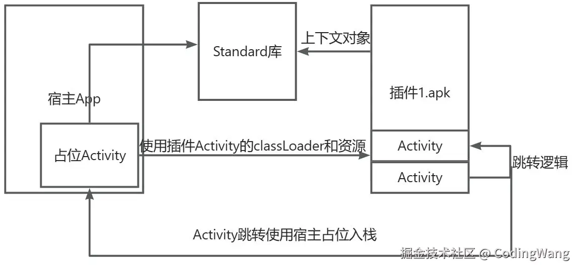 2.插件Activity的跳转需要依赖宿主的占位Activity来完成入栈出栈的效果。