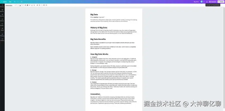 Canva Doc to Deck是Canva平台中的一项便捷AI功能,允许用户轻松将Canva文档转换为PPT。Canva是一款广受欢迎的在线设计工具,提供了丰富的模板、图形和设计元素,适用于各种设计目的。借助Canva Doc to Deck功能,用户可以快速将文档内容转化为专业的PPT演示文稿,进一步提升了设计和演示的效率。