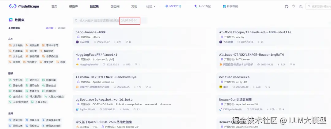 对了,微调要使用的数据集也可以到Model Scope下载,这里面有20943个不同种类的数据集。