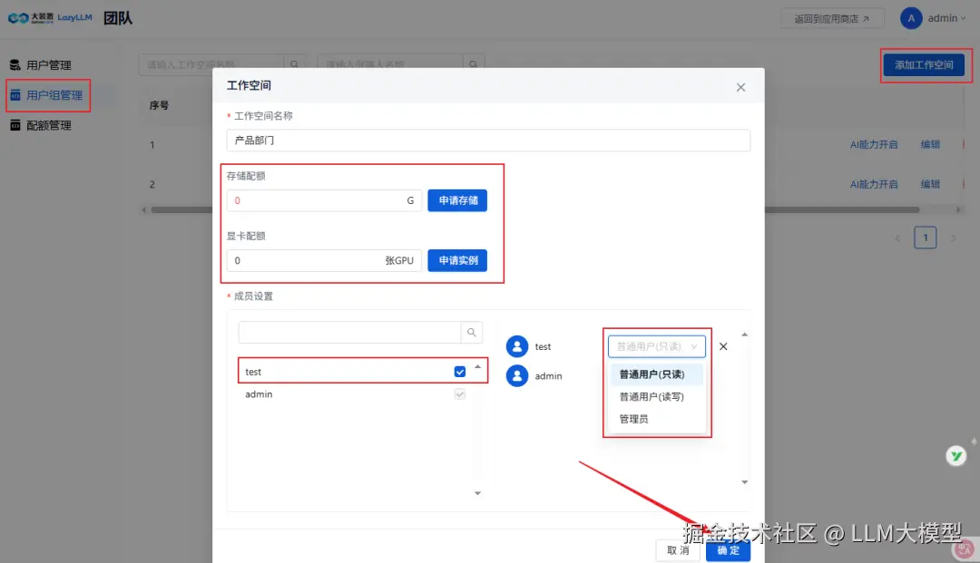 然后在「用户组管理」这里,比如说新增一个工作空间「产品部门」,可以把test这个用户加入这个空间,并且设置他的权限。