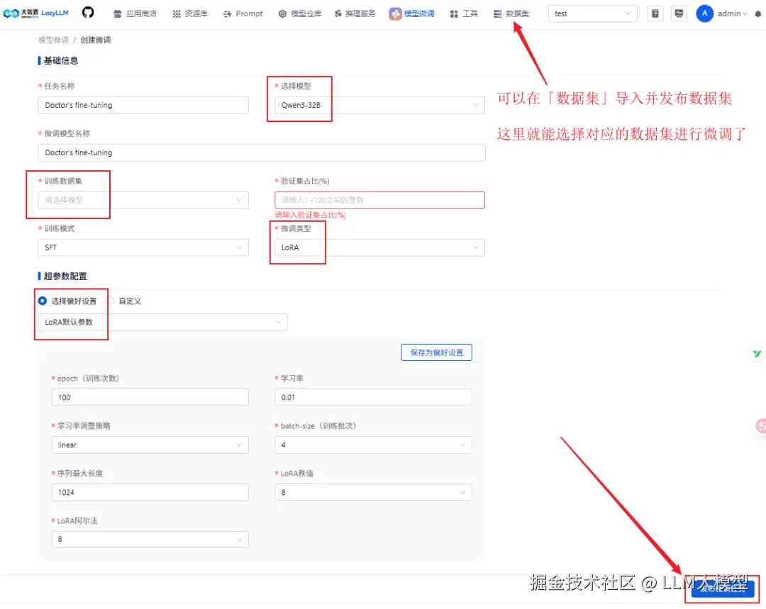 它直接把模型微调集成到平台里面了,只需要准备好数据集、模型,经过简单的配置就可以开始微调。