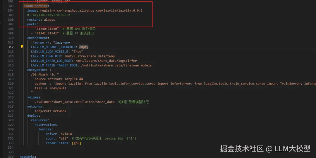 把docker-compose.yml文件里面cloud-service的相关注释像下图这样解开(因为这段默认是被注释掉的,也就是默认不会启动这个服务)