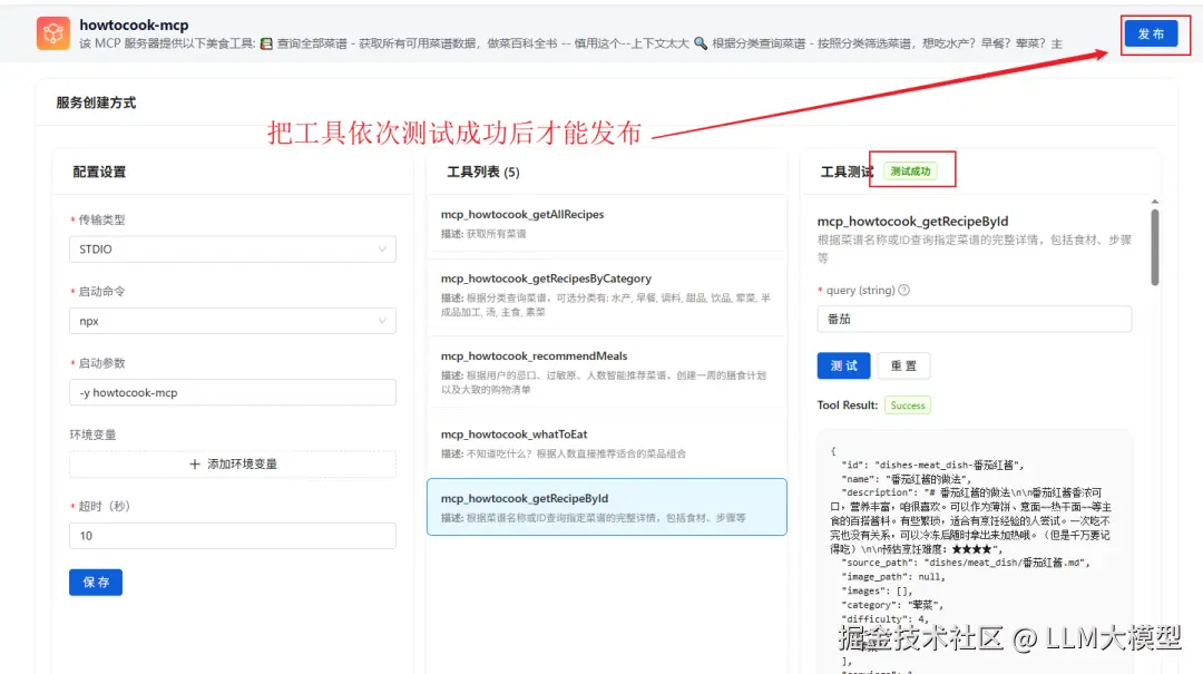 添加之后,还需要对这个MCP里面的工具逐一测试之后才能发布,发布后,就能在应用中使用这个MCP工具啦。