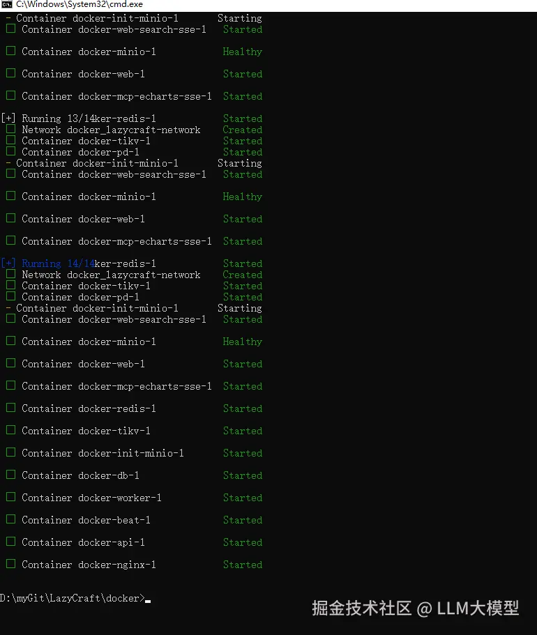 因为docker目录下有docker-compose.yml文件,所以我们可以在该目录下的控制台,直接使用 docker-compose up -d 指令一键把LazyCraft部署到本地: