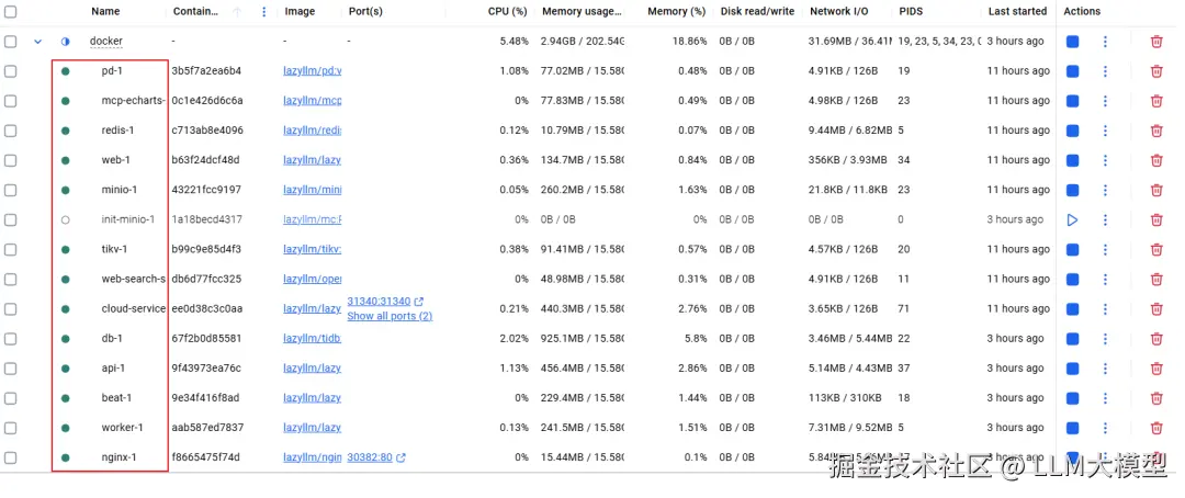 docker面板里面所有容器都是启动成功的状态(除了init-minio-1)