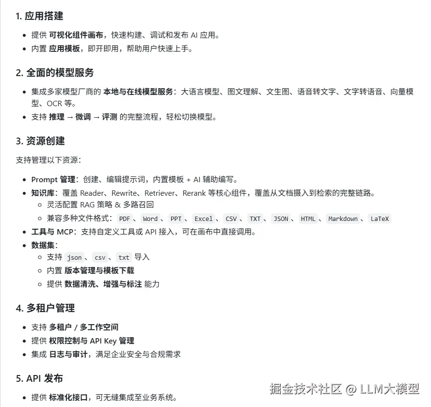 它提供的是一个功能更完整的闭环系统:包含了应用搭建的可视化界面,还内置了知识库、Prompt管理、推理服务、MCP工具(包含本地和远程)、数据集管理和模型评测等多个核心模块。